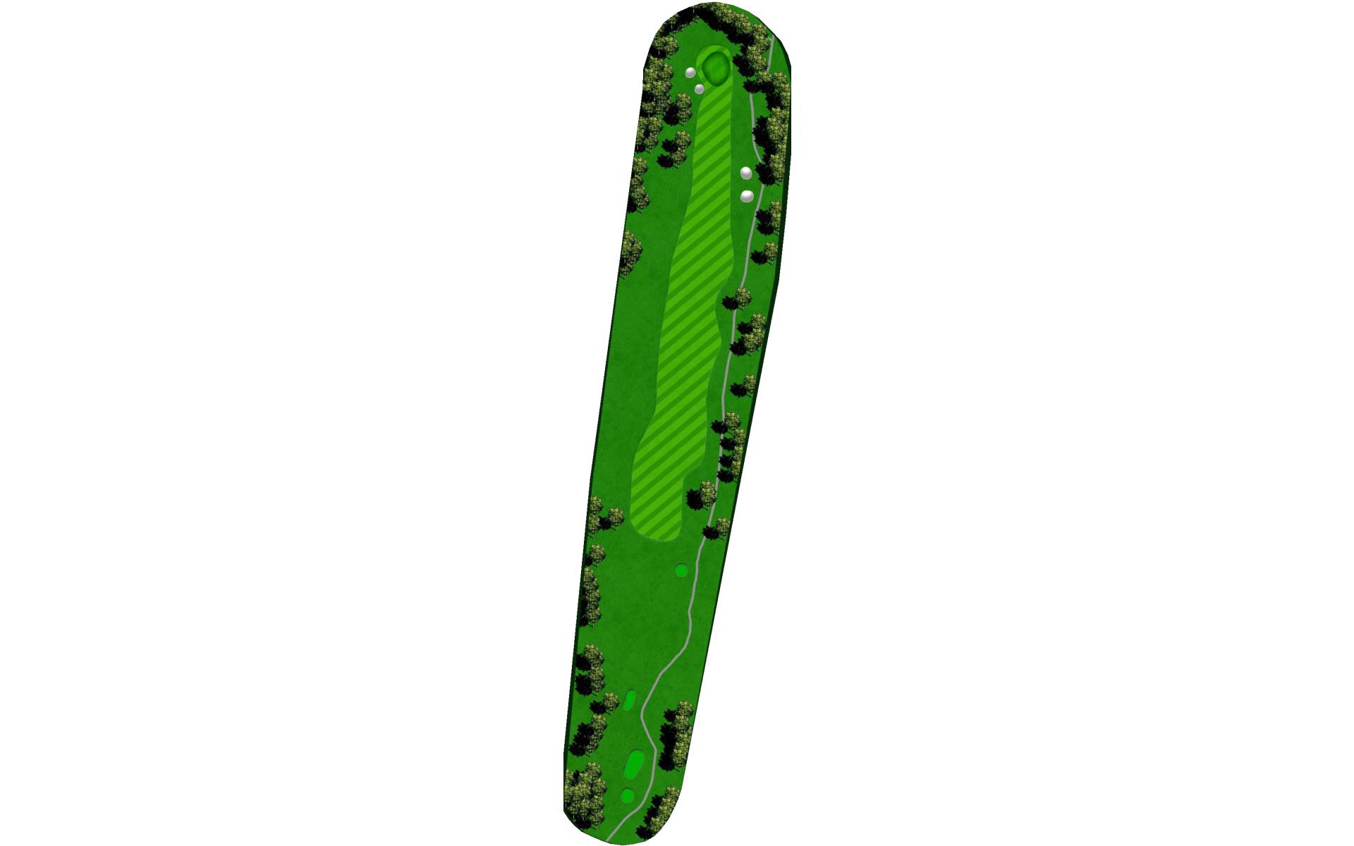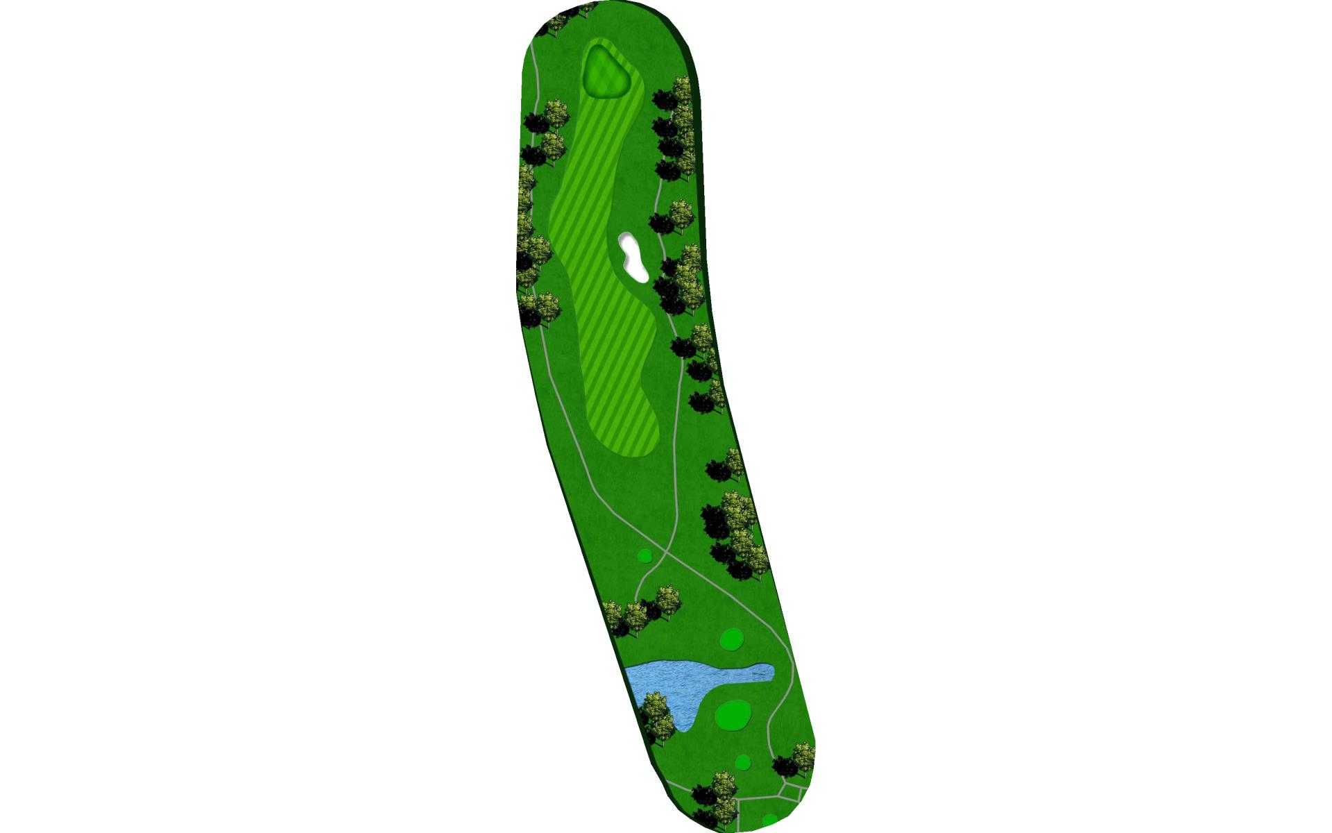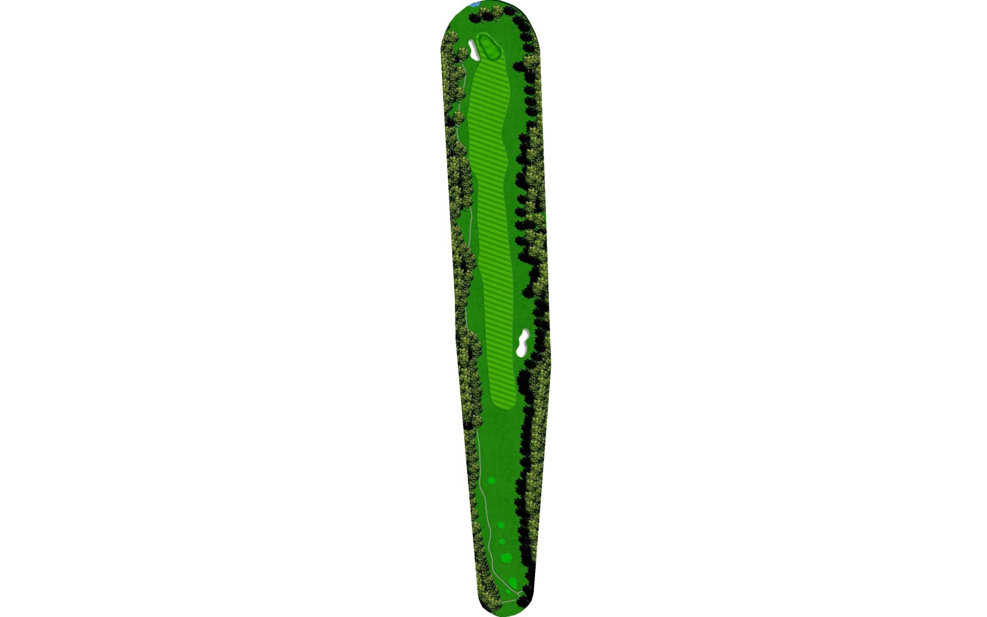 This slight dog leg left requires a precise tee shot that favors the right side of the fairway as the left is protected by trees and a Creek. Most players will have a long Iron in and need to favor the Center Left porton of the green to stay away from the Bunker and Water right of the green. This green as a decent amount of undulation in it so being in the correct section is vital.