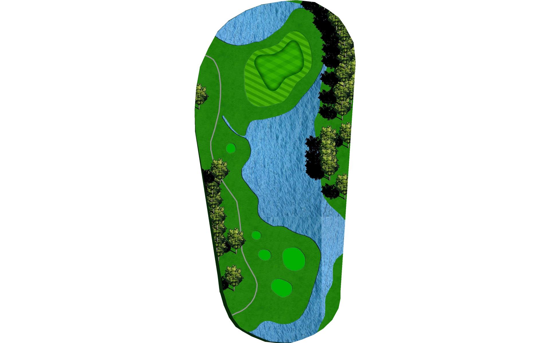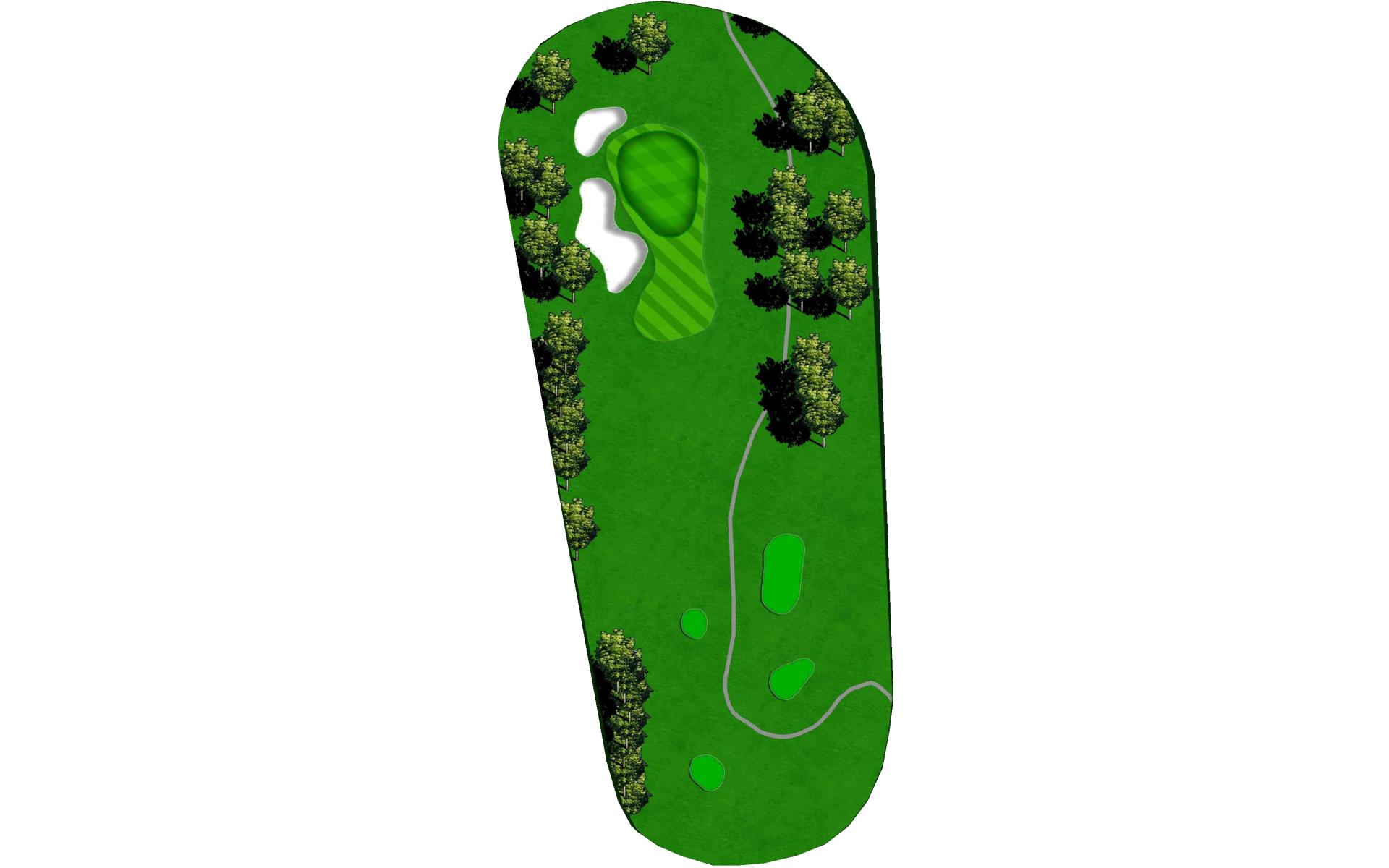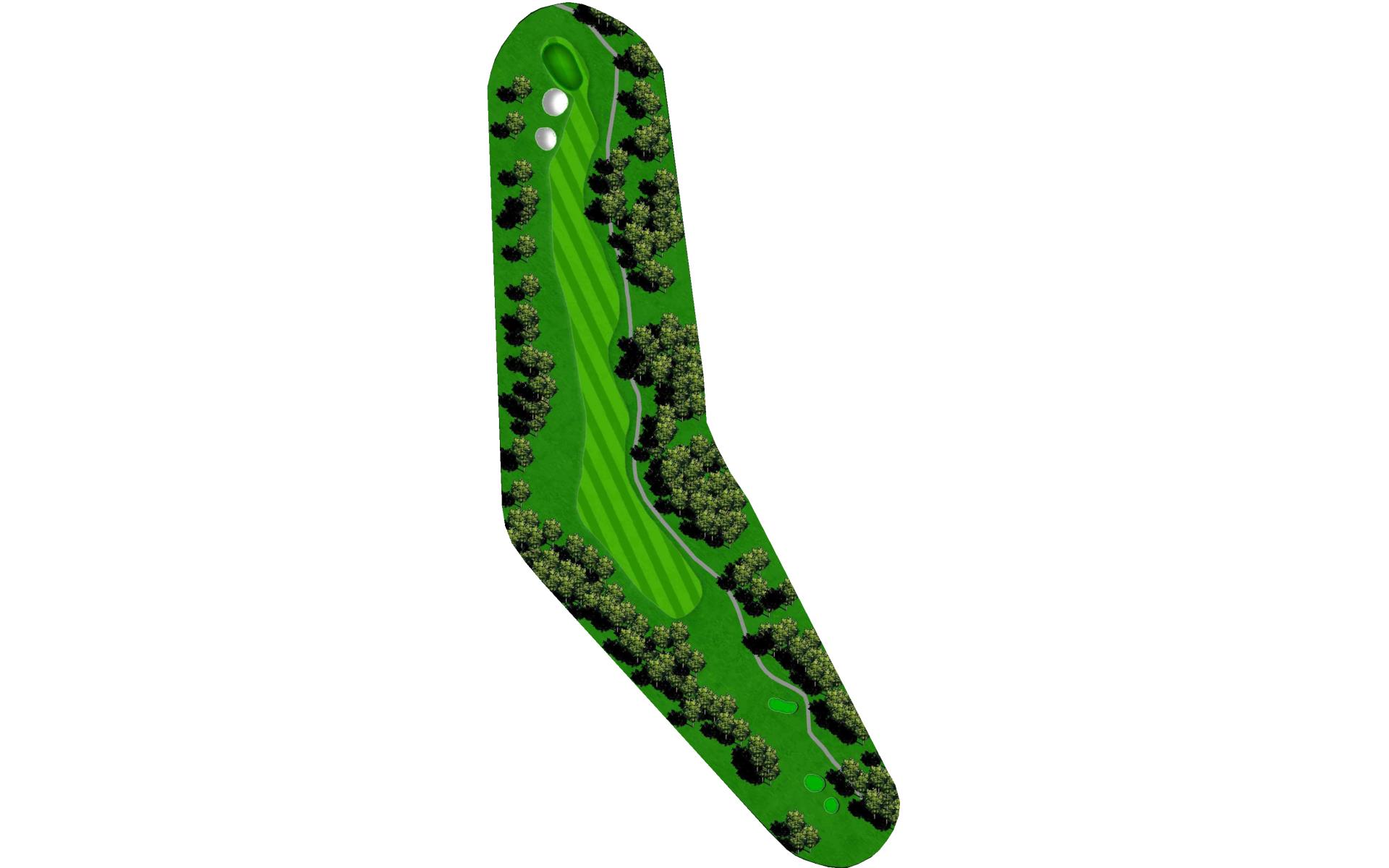This slight dog leg left requires a precise tee shot that favors the right side of the fairway as the left is protected by trees and a Creek. Most players will have a long Iron in and need to favor the Center Left porton of the green to stay away from the Bunker and Water right of the green. This green as a decent amount of undulation in it so being in the correct section is vital.