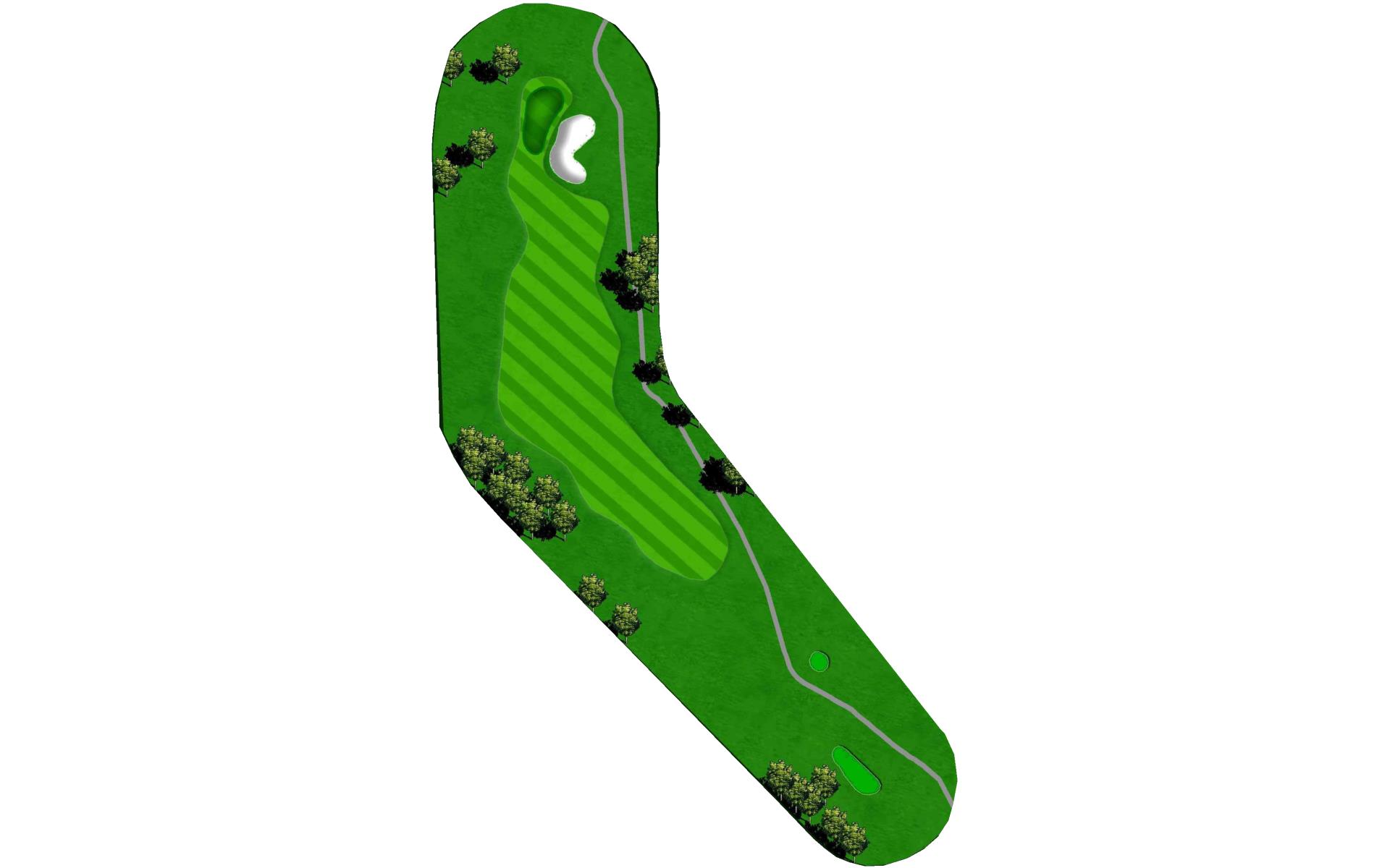 This dogleg left long par 4 starts the toughest 3 hole strech on the golf course. Longer hitters can try to challenge the Fairway Bunker but if you do not have the length then a perfect drive is right at the 150 yard marker. The second shot needs to favor the right side of the green as there are bunkers protecting the green.