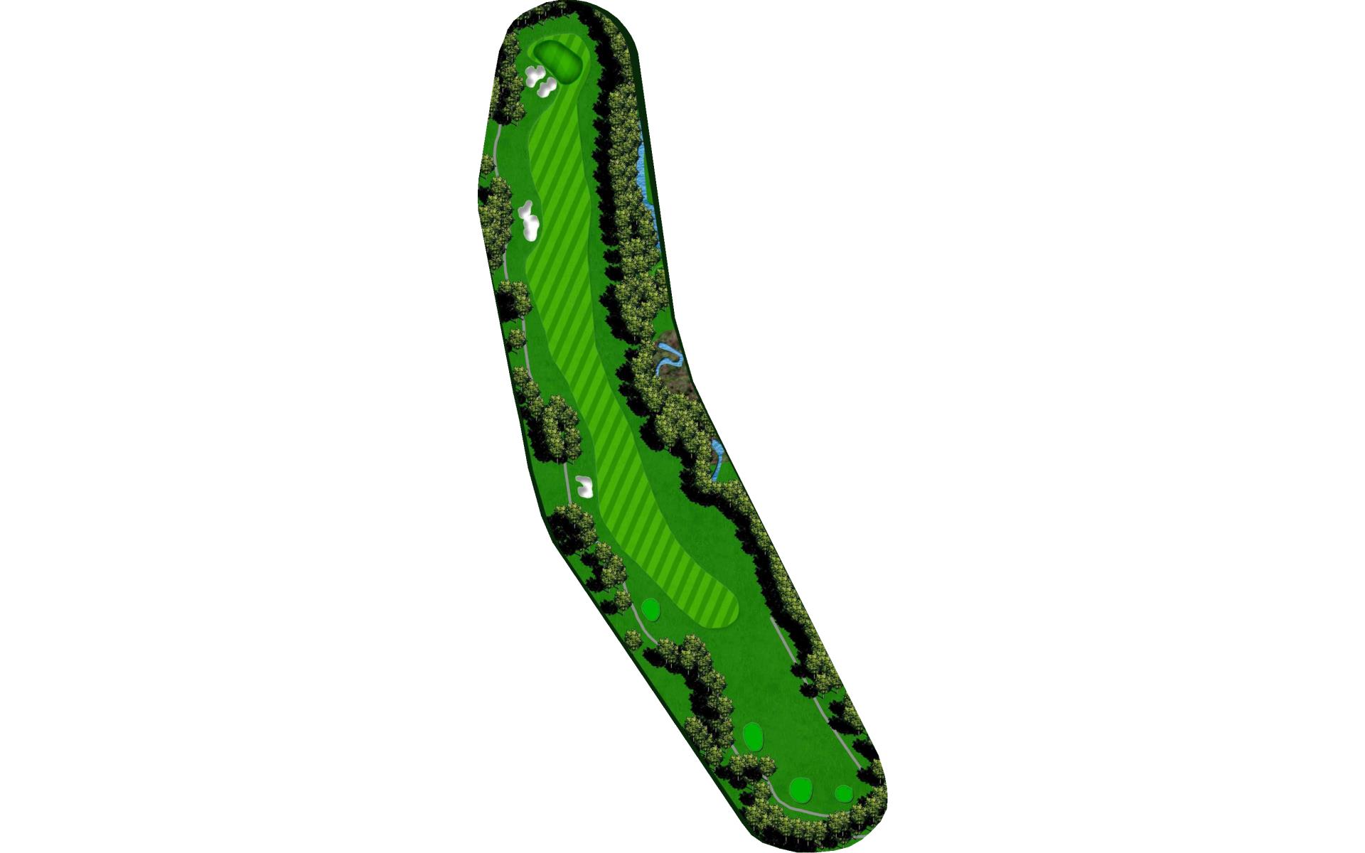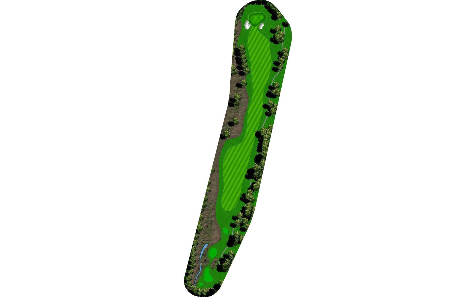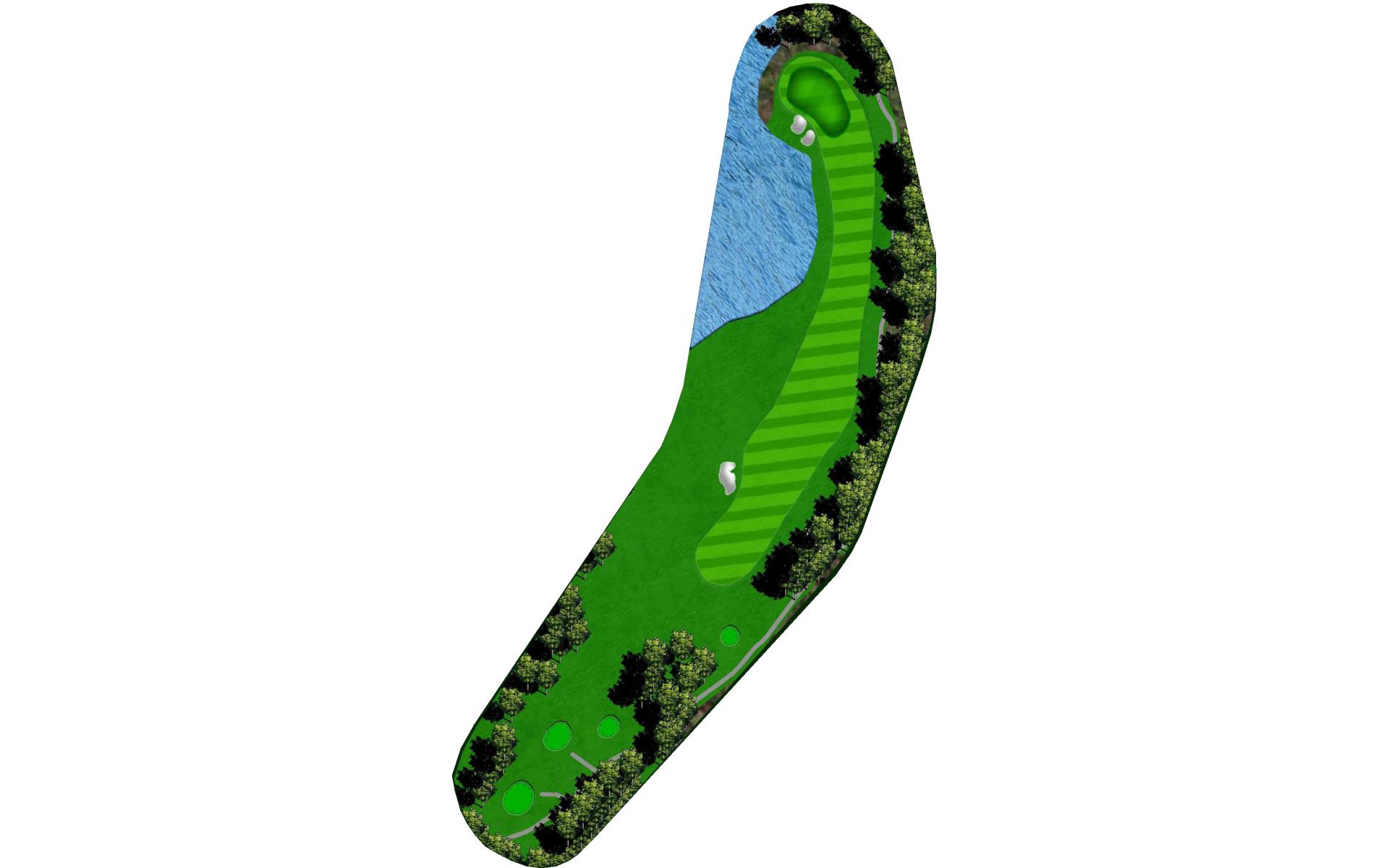 A shorter par 4 with bunkers on the left and water on the right. Any shot in the fairway will leave you with a good look at the green.