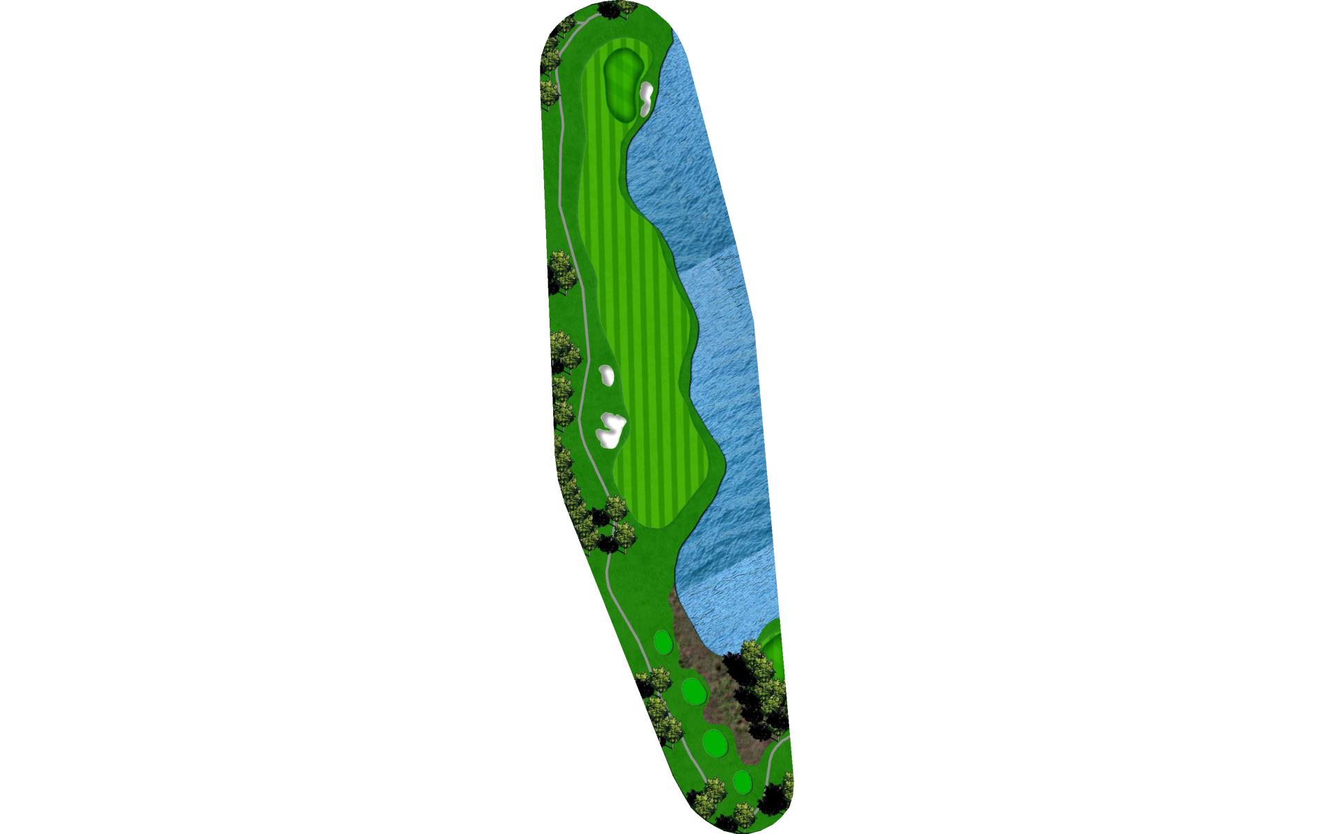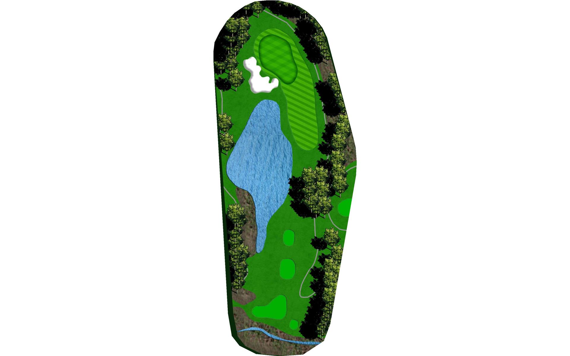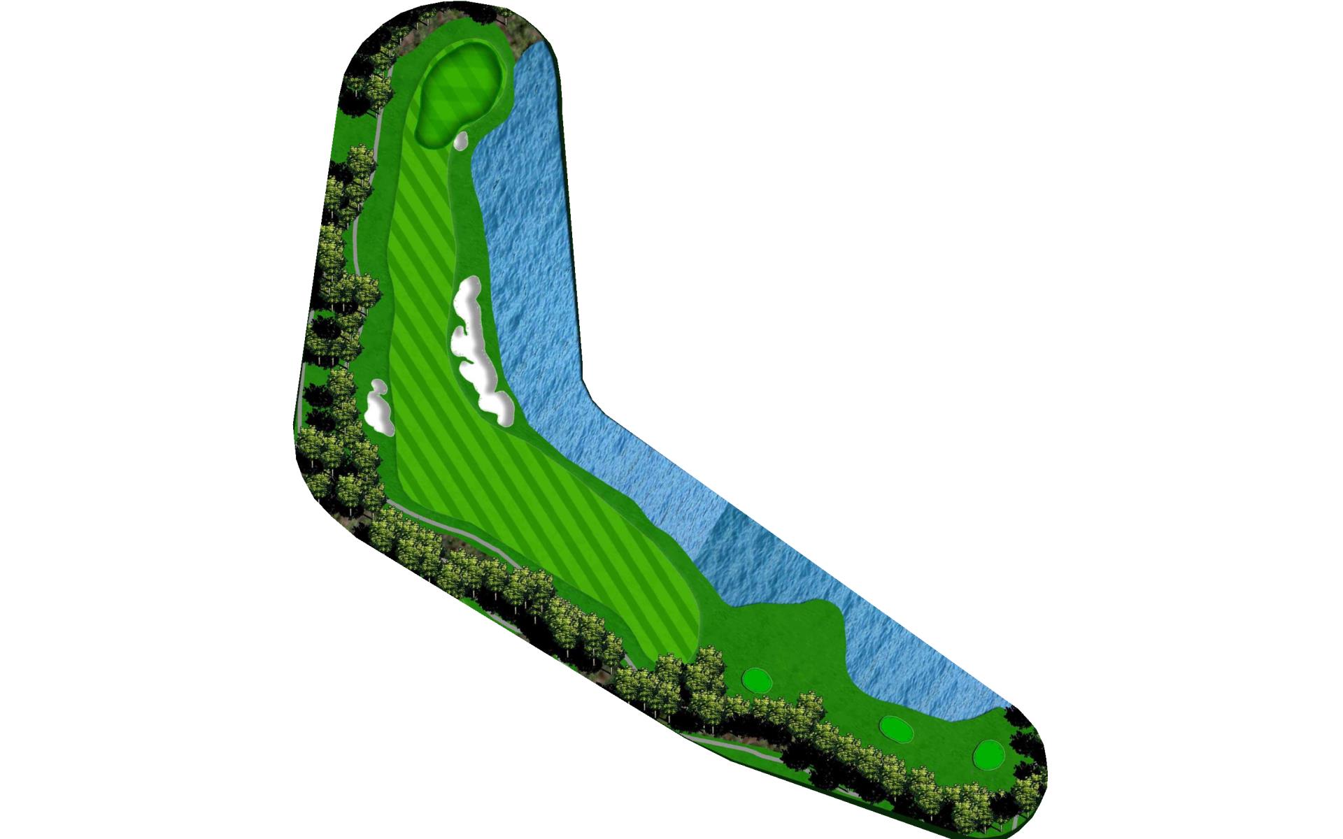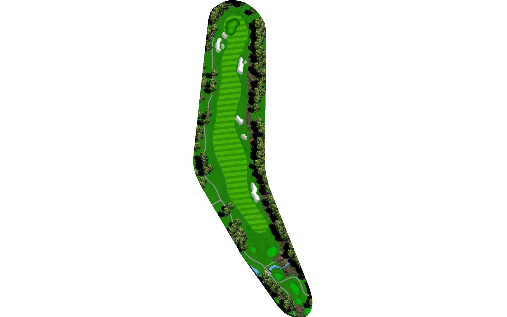 A shorter par 4 with bunkers on the left and water on the right. Any shot in the fairway will leave you with a good look at the green.
