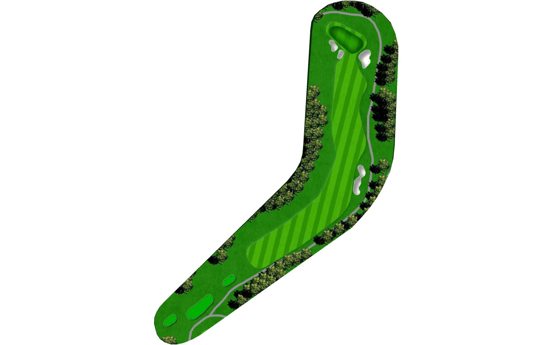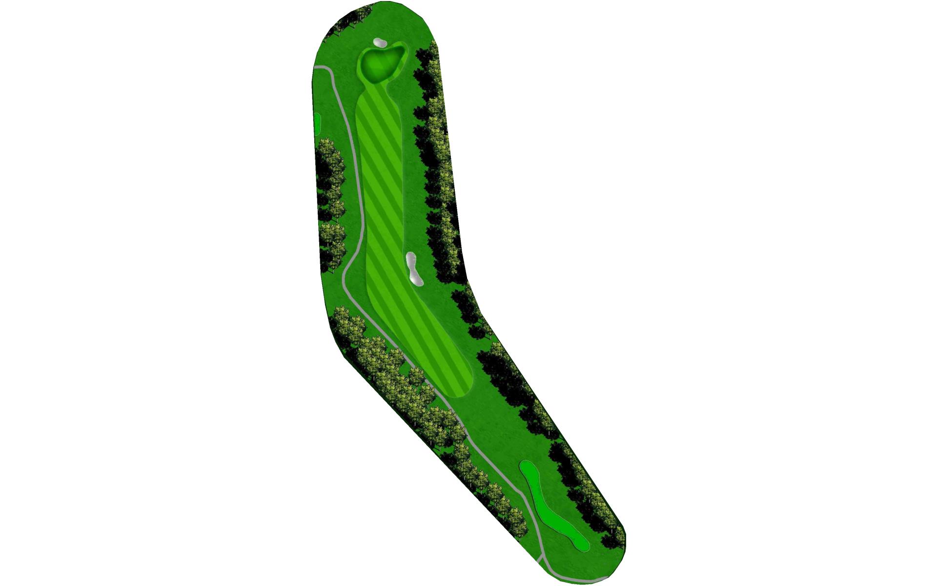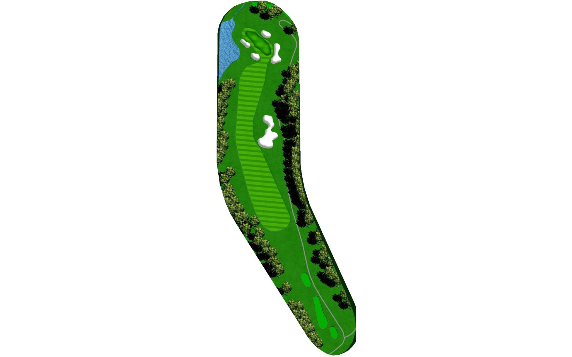 Par 4 that gently doglegs right. A long fairway bunker down the right side of the fairway discourages players from attempting to cut off the dogleg. A narrow green protected by bunkers requires a shot with precise distance control.