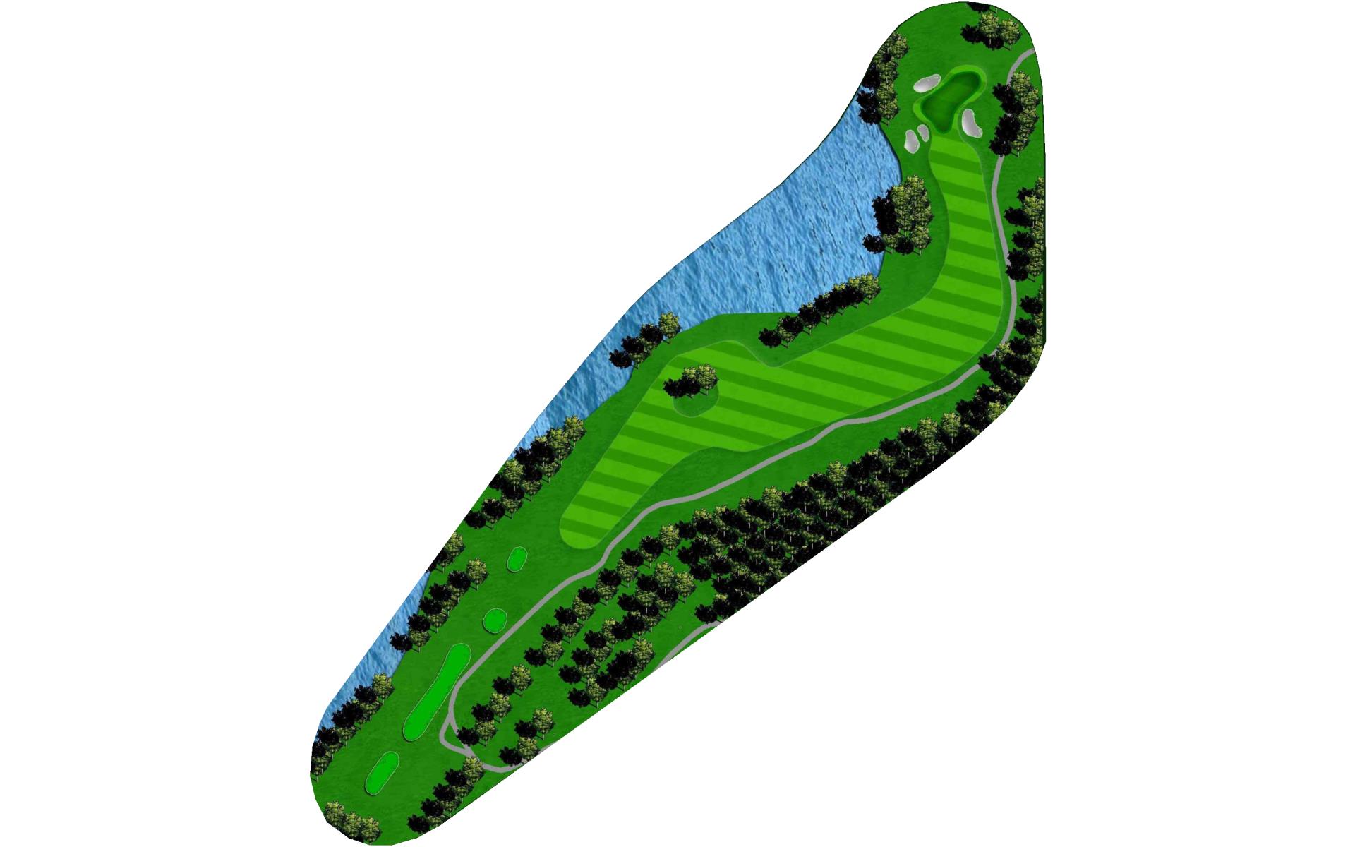 Par 5 with water all down the left side, only the bravest and longest of hitters will attempt this green in two, the prudent play is to place the ball down the right side of the fairway and past a group of trees guarding the front of the green.